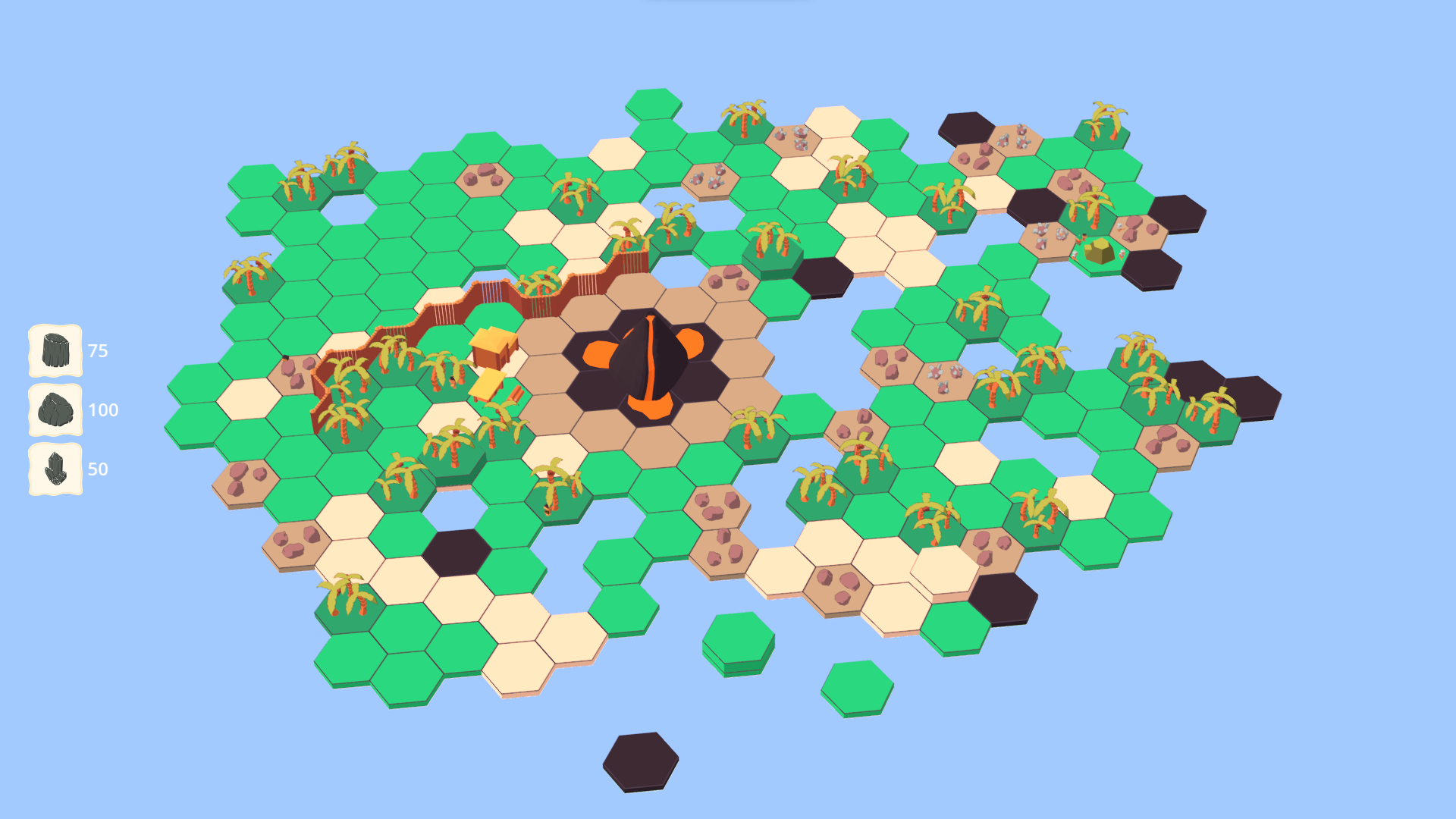 - Procedural Map Generation - The island expands randomly around the volcano. Some runs may have more trees than stone or some runs may have too many rivers.